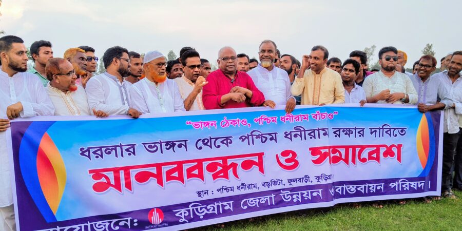নদী ভাঙ্গন কবলিত এলাকার মানুষের দুর্দশা লাঘবে কুড়িগ্রাম জেলা উন্নয়ন ও বাস্তবায়ন পরিষদের উদ্যোগে রোববার বিকেলে মানববন্ধন ও সমাবেশ অনুষ্ঠিত হয়।