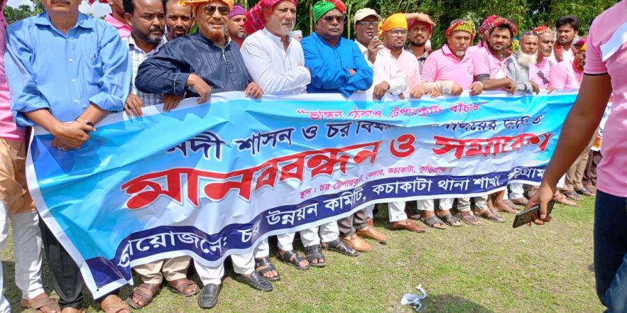 নদী ভাঙ্গনে আর ঠিকানা বদল করতে চাই না, নদী ভাঙ্গন থেকে বাঁচতে চাই, পার্বত্য বিষয়ক মন্ত্রণালয়ের মতো চর বিষয়ক মন্ত্রণালয়ের দাবিতে কুড়িগ্রামের কচাকাটা থানার কেদার ইউনিয়নের দুধকুমার নদের তীরে টেপারকুটিতে মানববন্ধন ও সমাবেশ অনুষ্ঠিত হয়েছে।