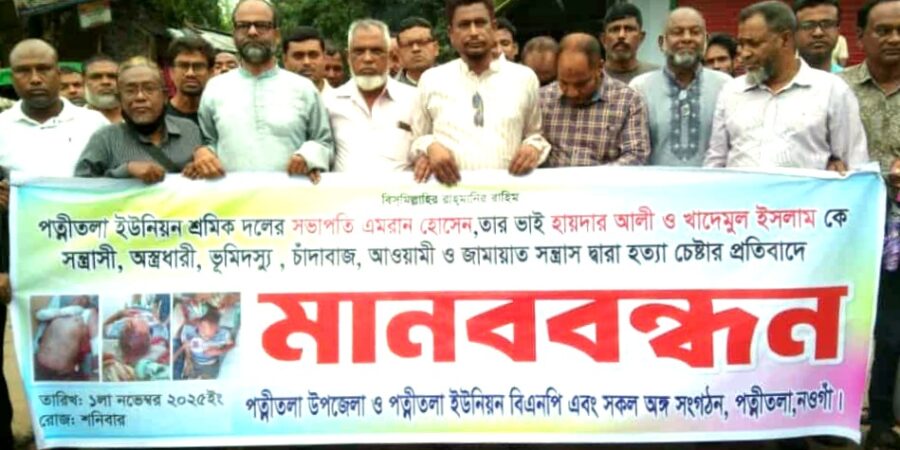 নওগাঁর পত্নীতলায় ইউনিয়ন শ্রমিক দলের সভাপতি এমরান হোসেন, তার ভাই হায়দার আলী ও খাদেমুল ইসলাম কে সন্ত্রাসী, অস্ত্রধারী, ভূমিদস্যু, চাঁদাবাজ, আওয়ামী ও জামায়াত সন্ত্রাস দ্বারা হামলা ও হত্যা চেষ্টার প্রতিবাদে উপজেলা ও পত্নীতলা ইউনিয়ন বিএনপি এবং সকল অঙ্গ সংগঠনের নেতাকর্মীদের অংশগ্রহনে শনিবার উপজেলার কাটাবাড়ি বাজার এলাকায় এক মানববন্ধন কর্মসূচি পালিত হয়েছে।