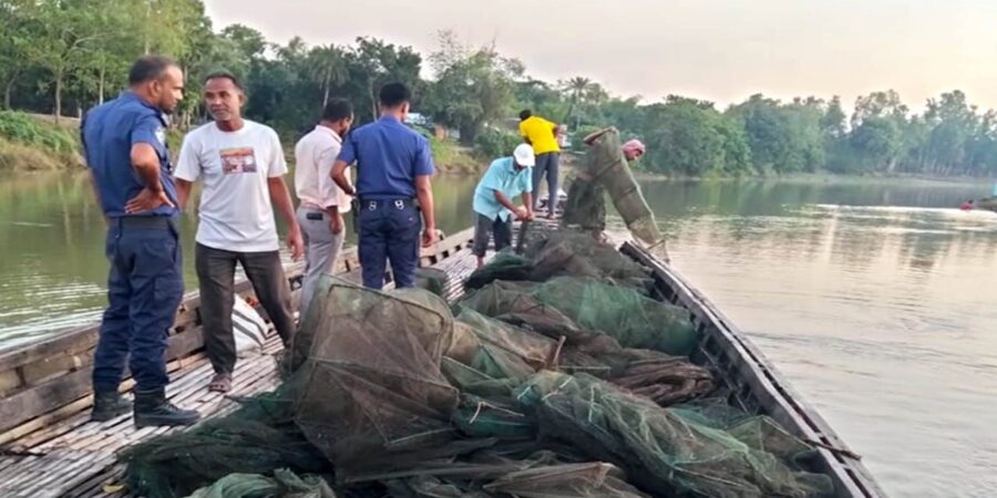 নওগাঁর রাণীনগরে নিষিদ্ধ চায়না দুয়ারী জাল বিনষ্ট