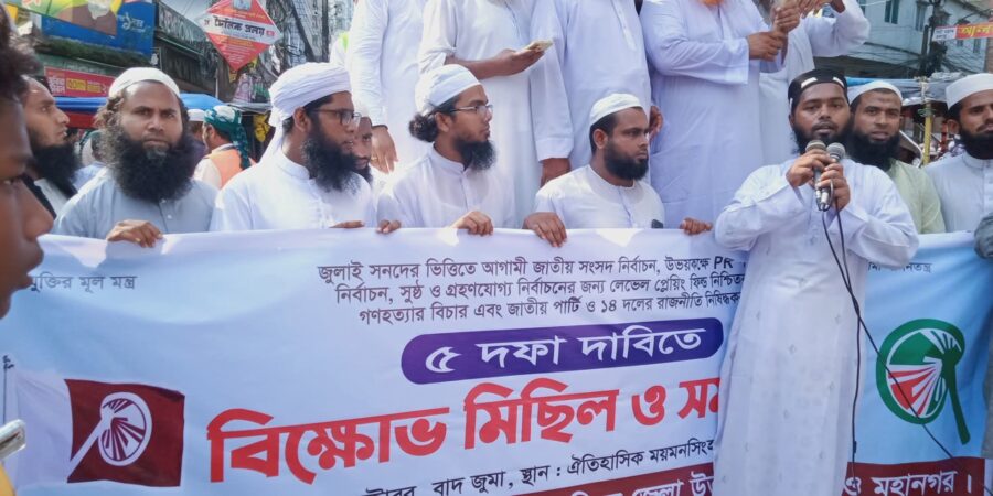 ইসলামী আন্দোলন বাংলাদেশ ময়মনসিংহ জেলা উত্তর ও দক্ষিণ এবং মহানগর শাখার উদ্যোগে পিআর পদ্ধতিতে জাতীয় নির্বাচন ৫ দফা দাবী বাস্তবায়নের জন্য শুক্রবার বিক্ষোভ মিছিল ও সমাবেশ বিকেলে অনুষ্ঠিত হয়।