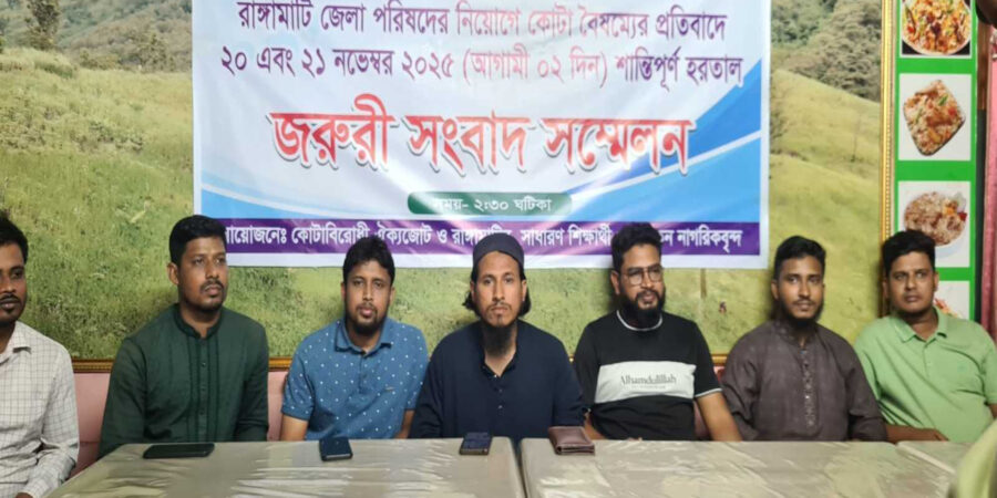 নেতারা বলেন, ‘রাঙ্গামাটি পার্বত্য জেলা পরিষদের প্রকাশিত নিয়োগ বিজ্ঞপ্তিতে কোনো কোটার উল্লেখ নেই এবং শূন্যপদের সংখ্যাও পরিষ্কারভাবে জানানো হয়নি। সরকার নির্ধারিত ৭ শতাংশ কোটা বিধান উপেক্ষা করে পরিষদ কর্তৃপক্ষ ৭০ শতাংশ পাহাড়ি ও ৩০ শতাংশ বাঙালি কোটা অনুসারে নিয়োগ বাস্তয়নের উদ্যোগ নিয়েছে, যা দুঃখজনক। মেধা ও যোগ্যতার ভিত্তিতে নিয়োগ দিতে হবে। কোটা প্রথার নামে বৈষম্য আর মেধা হত্যার সিদ্ধান্ত আমরা মেনে নেব না।