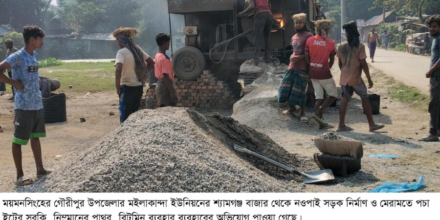 ময়মনসিংহের গৌরীপুর উপজেলার মইলাকান্দা ইউনিয়নের শ্যামগঞ্জ বাজার থেকে নওপাই সড়ক নির্মাণ ও মেরামতে পচা ইটের সুরকি, নিম্নমানের পাথর, বিটুমিন ব্যবহার ব্যবহারের অভিযোগ পাওয়া গেছে। ধুলোবালির উপরে সড়ক নির্মাণের পরপরেই উঠে যাচ্ছে কার্পেটিং। নিম্নমানের ও অতিরিক্ত গরমে বিটুমিন ব্যবহারের কারণে একাধিক স্থানে কার্পেটিংয়ে নুড়ি পাথর খসে পরছে।