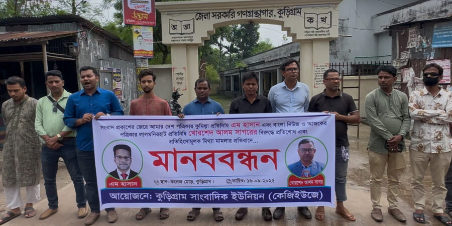 কুমিল্লার আমার দেশ পত্রিকার জেলা প্রতিনিধি এম. হাসান ও লালমনিরহাটের আজকের পত্রিকার জেলা প্রতিনিধি খোরশেদ আলম সাগরের নামে মিথ্যা ও হয়রানিমূলক মামলা প্রত্যাহারের দাবিতে মানববন্ধন করেছে কুড়িগ্রাম সাংবাদিক ইউনিয়ন (কেজিইউজে)।
