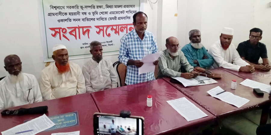 সিলেটের বিশ্বনাথে সরকারি ভূ-সম্পত্তি রক্ষা, মিথ্যা মামলা প্রত্যাহার, গ্রামবাসীকে হয়রাণী বন্ধ ও ভূমি খেকো অ্যাডভোকেট শামীমের ওকালতি সনদ বাতিল’র দাবীতে সংবাদ সম্মেলন করেছেন উপজেলার খাজাঞ্চী ইউনিয়নের তেঘরী গ্রামবাসী।