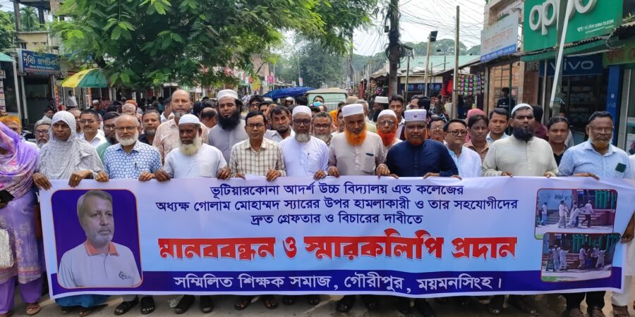 ময়মনসিংহের গৌরীপুরে শিক্ষক লাঞ্ছিতের ঘটনায় সম্মিলিত শিক্ষক সমাজের মানববন্ধন
