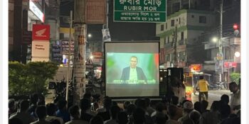 নওগাঁয় বিএনপির ভারপ্রাপ্ত চেয়ারম্যান তারেক রহমানের সাক্ষাৎকার প্রদর্শনীতে মানুষের ঢল